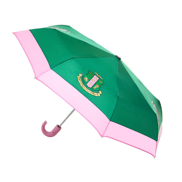 Mini automatic up/down umbrella; green with pink border and matching pink, curved handle. Crest logo.