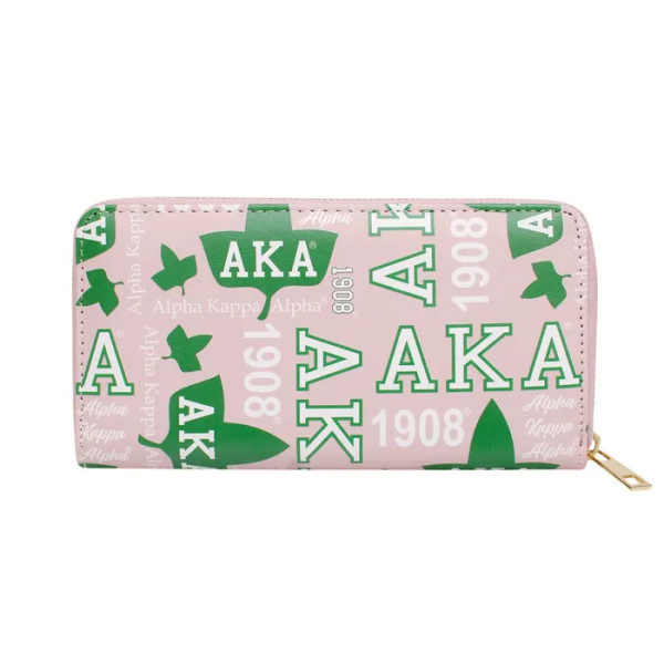 Upgrade your retail offerings with this Alpha Kappa Alpha Sorority Pride Graphic Print Zipper Wallet, designed for customers who love to carry their sisterhood with style. Featuring a pink and green all over ivy leaf graphic print on sleek faux leather, this collegiate-chic wallet is as functional as it is fashionable. The main zipper closure opens to a black faux leather interior complete with a main panel, card slot panel, card pockets, central compartment, and zippered compartment. Finished with a gold metal zipper, this wallet combines everyday utility with elevated AKA pride.