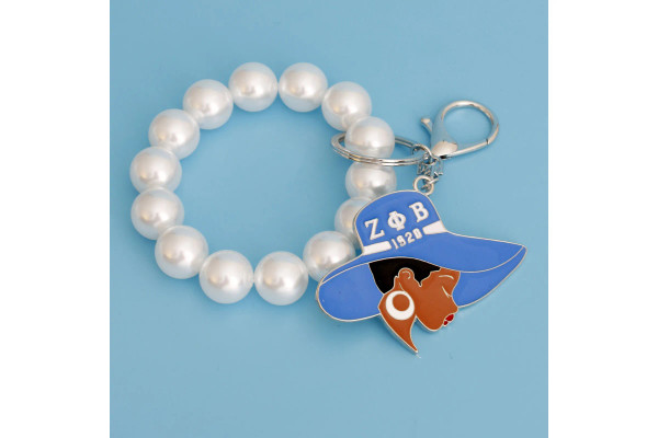 Sorority Inspired Keychain Handbag Charm Featuring Stretch White Pearl Wristlet Bracelet, Keyring, and Clip. Charm is Silver Metal with Blue and White Epoxy Woman Wearing Wide Brim Hat Featuring Greek Lettering and Date. Charm measures 2.25" x 2.75".