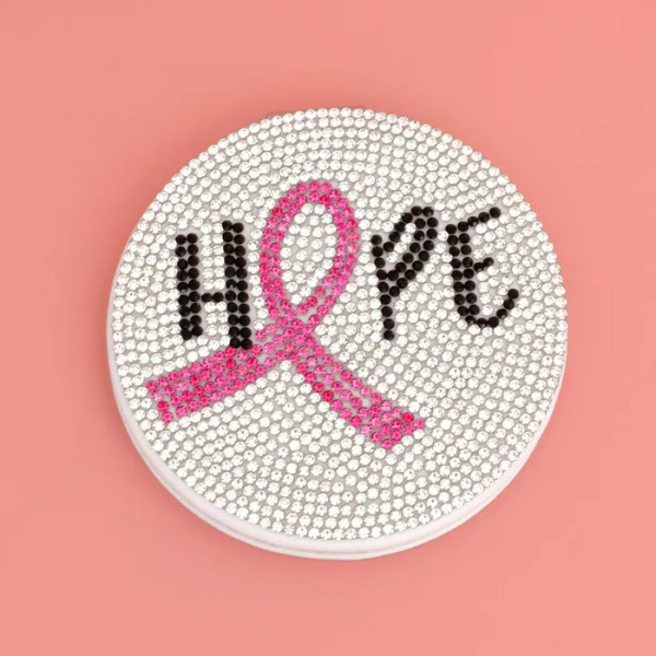 Reflect your inner strength and style with our HOPE Breast Cancer Ribbon Bling Mirror Compact. This elegant accessory features a dazzling combination of pink, black, and clear rhinestones set against a white faux leather coating and silver metal frame. The compact opens with a hinge to reveal a regular plane mirror and a magnified mirror, both designed with anti-fog glass for a crystal-clear reflection every time. Perfectly sized for your handbag, this compact is a chic reminder of hope and resilience wherever you go.