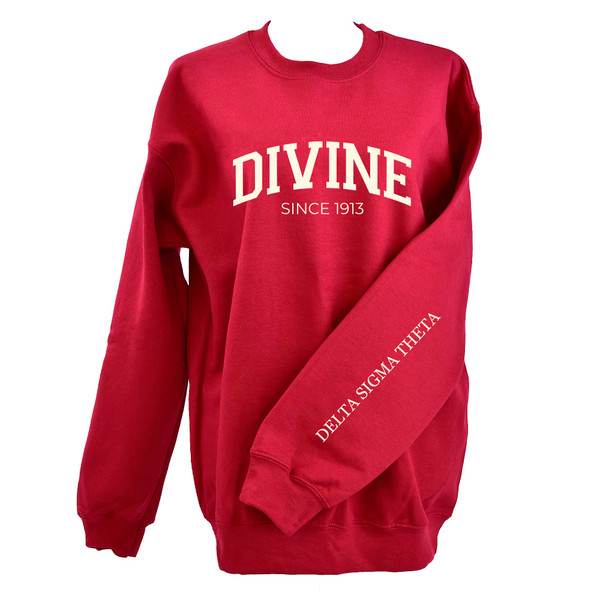 Celebrate the power, purpose, and sisterhood of Delta Sigma Theta with this bold crimson red DIVINE crewneck sweatshirt. Designed to reflect the strength and legacy of the sorority, this classic piece features collegiate-style DIVINE lettering across the chest with the founding year beneath, while the sleeve proudly displays Delta Sigma Theta for a polished, sorority-proud finish. Perfect for chapter events, campus wear, service days, or everyday comfort.