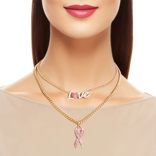 This Double Layer Gold Metal Curb Chain Necklace with Rhinestone Love Heart and Breast Cancer Ribbon Pendants isn't just jewelry; it's a symbol of love, support, and style. Don't miss the opportunity to wear your heart on your chest and make a fashionable statement while supporting a crucial cause-get yours now and show the world that love conquers all!