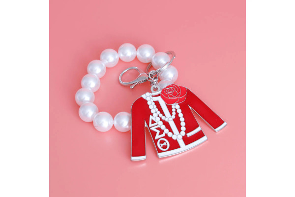 Silver Metal Keychain Handbag Charm Featuring Stretch Pearl Wristlet Bracelet, Keyring, Clip, and Sorority Inspired Silver Metal with Red and White Epoxy Sweater Shaped Charm Featuring Red Flower, Pearls, and Greek Letter Details.