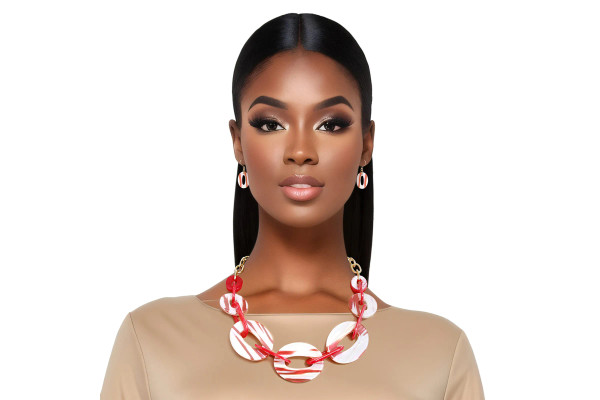 Sorority Inspired Shiny Gold Oval Link Chain Necklace Set Featuring Graduated Striped Red and White Celluloid Oval Links and Marbled Red Rectangle Link Details. Center Oval Links measure 2 inches each. Matching earrings measure 1.25 inches.