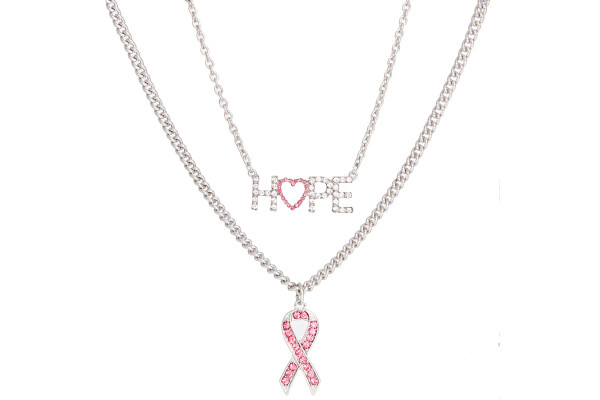 Elevate your style and show your support with our Double Layer Silver Metal Curb Chain Necklace - a symbol of hope, strength, and fashionable awareness. This necklace is more than just jewelry; it's a statement of your commitment to the fight against breast cancer. With its Clear and Pink Rhinestone HOPE Station Pendant on a 16" layer and Pink Rhinestone Breast Cancer Ribbon Pendant on an 18" layer, it's the ultimate accessory for making a fashionable impact. Here's why you should make it yours.