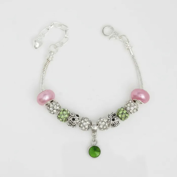 Show off your sorority spirit with this charm bracelet. Featuring a European-style silver snake chain, it's decked out with luxe green and clear rhinestone slide charms, engraved silver accents, playful acrylic pearl pink charms, and a dangling green rhinestone charm. The lobster clasp with heart charm extension ensures a comfy, adjustable fit for every wrist.