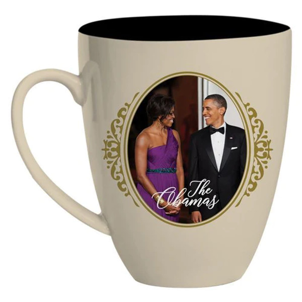 A high-quality two-tone mug featuring an image of former First Couple Barack and Michelle Obama dressed in formal attire. This ceramic mug commemorates a time where the White House exemplified true leadership and makes the perfect gift for anyone who appreciates this power couple. The mug's exterior is beige and interior is black.