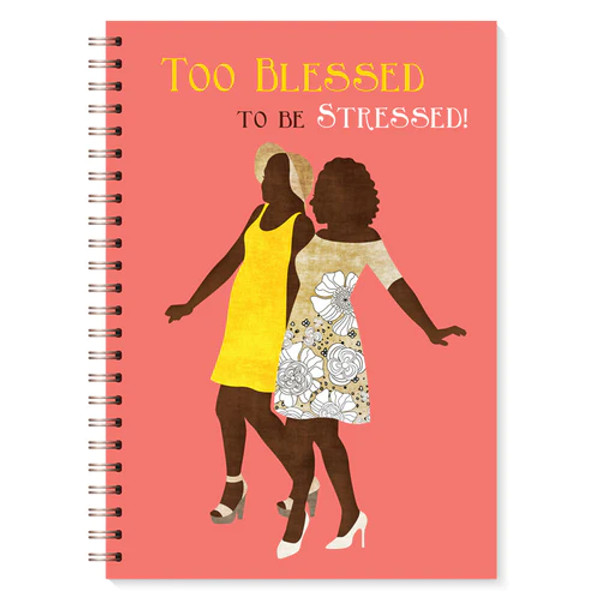 A beautiful spiral bound journal adorned with black art. Illustrated with cute and sassy silhouettes of two African American women, the journal's pink cover is accompanied with the uplifting phrase, "Too Blessed to be Stressed." Enclosed in a sturdy, heavy-duty cover and finished in a matte coating, this beautiful journal measures 8.5 x 6.25 inches and has 128 pages. At the top of each page is a daily scripture from the Bible.
