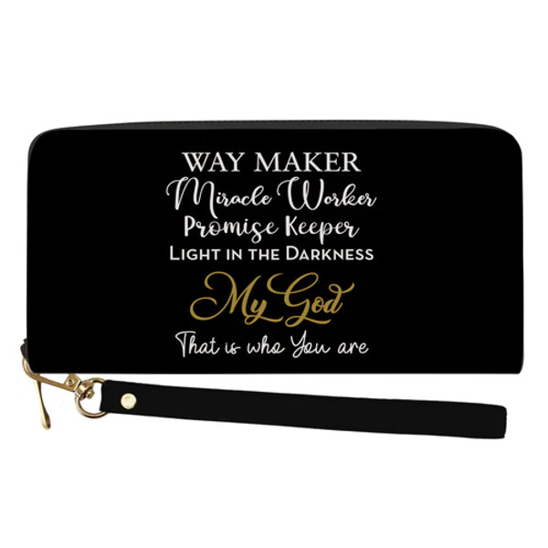 A gorgeous and practical women's wallet adorned with the popular Way Maker verse on a sleek black leather-like material.