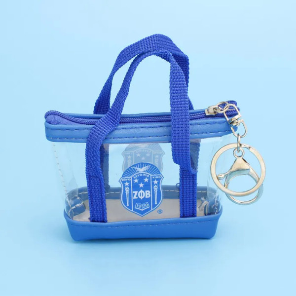 Show off your Zeta Phi Beta pride with our chic Wholesale ZPB Sorority Mini Tote Zipper Pouch Keychain Clip. This adorable accessory features a clear PVC mini tote bag-shaped zipper pouch with sturdy canvas straps, adorned with a bold blue and white ZPB Shield graphic print on both sides. Perfectly sized for your AirPods, this pouch comes with a silver metal keychain ring and handbag clip for added convenience. Keep your essentials close at hand with a touch of sorority elegance.