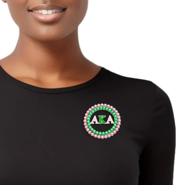 Elevate your style and showcase your Alpha Kappa Alpha (AKA) pride with our Women's Brooch Pin-an exquisite accessory that seamlessly blends sophistication with sorority spirit. This round circle design boasts silver metal, green pearl studs, a pink rhinestone edge, and a distinctive AKA detail. Fastened securely with a safety pin C clasp closure, this brooch is not just an accessory; it's a statement of elegance and sisterhood. Let's dive into the features that make this brooch a must-have for your collection:
