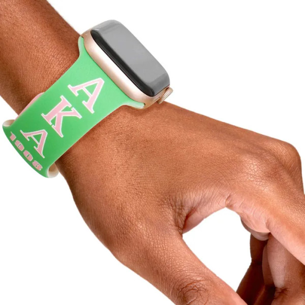 Elevate your timepiece with our Wholesale AKA Sorority Pink and Green Watch Band Strap. This Alpha Kappa Alpha Sorority Paraphernalia Women's Sports Watch Band combines function with flair. Crafted from half green and half pink soft silicone, it showcases the iconic AKA, 1908, and Shield graphic detail. Waterproof and lightweight, this wrist-friendly silicone band is perfect for any occasion. Designed to fit 38, 40, and 41 mm watches, it features a push-notch stainless steel button closure for secure wear. Measuring .85" wide, this watch band blends sorority pride with everyday elegance.