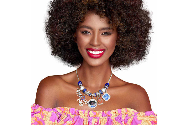 Silver Metal Omega Chain Necklace Featuring Royal Blue and White Sorority Inspired Rhinestone Charms and Slide Beads. Charms include Greek Letters, Hand Sign, Flower, 1920, and Round Woman. Round Center Charm measures 1.15 inches.