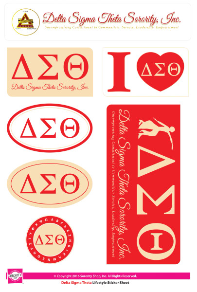 Get your "Greek On" with these high quality Delta Sigma Theta Lifestyle stickers! Each sheet contains 7 stickers ranging in size from a 2" circle to a generous 6.5"x 3" rectangle. Printed on sturdy vinyl, they are easily removed or repositioned leaving NO STICKY RESIDUE!