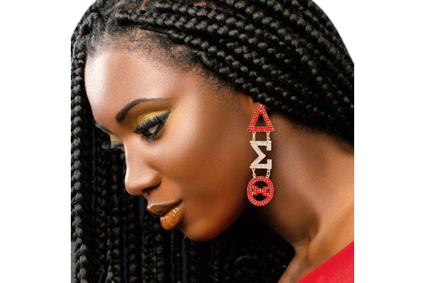 Gold Metal and Rhinestone Sorority Inspired Sign Dangle Drop Earrings Featuring Red, Clear, and Then Red Design. Earrings measure .75 inches wide.