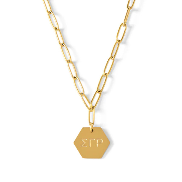 The perfect gift of Sisterhood! Our Paperclip Style Chain Sorority Necklace features your sorority's Greek letters on a 15mm hexagon shaped pendant, with a paperclip style chain, all dipped in 18K Champagne gold! Perfect for a bid day gift, big little gift or a treat for yourself!