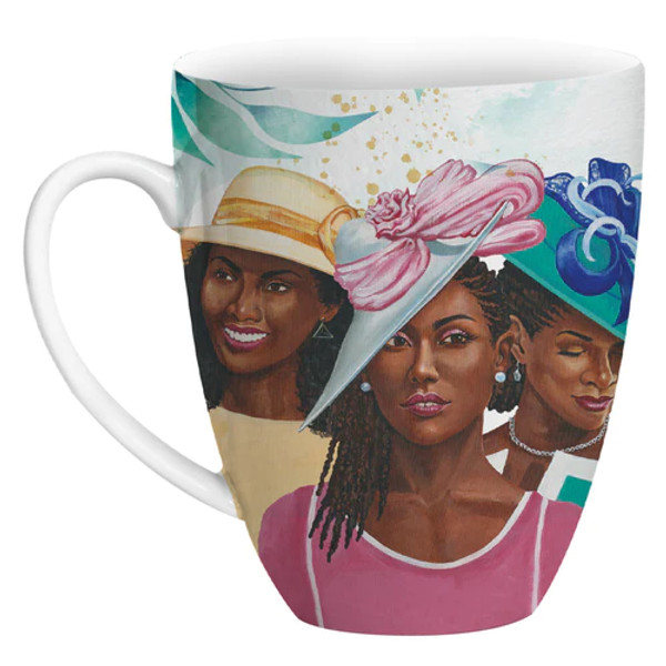 A high-quality mug featuring three beautiful ladies in their Sunday best. The mug's exterior is white with turquoise and the text is in gold, the interior is white.